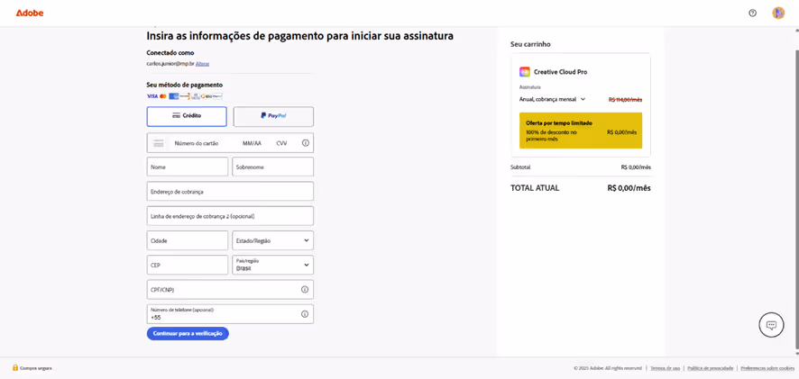Passo 5: Preencha suas informações de cobrança, com as informações solicitadas no formulário e clique em “continuar para verificação”.